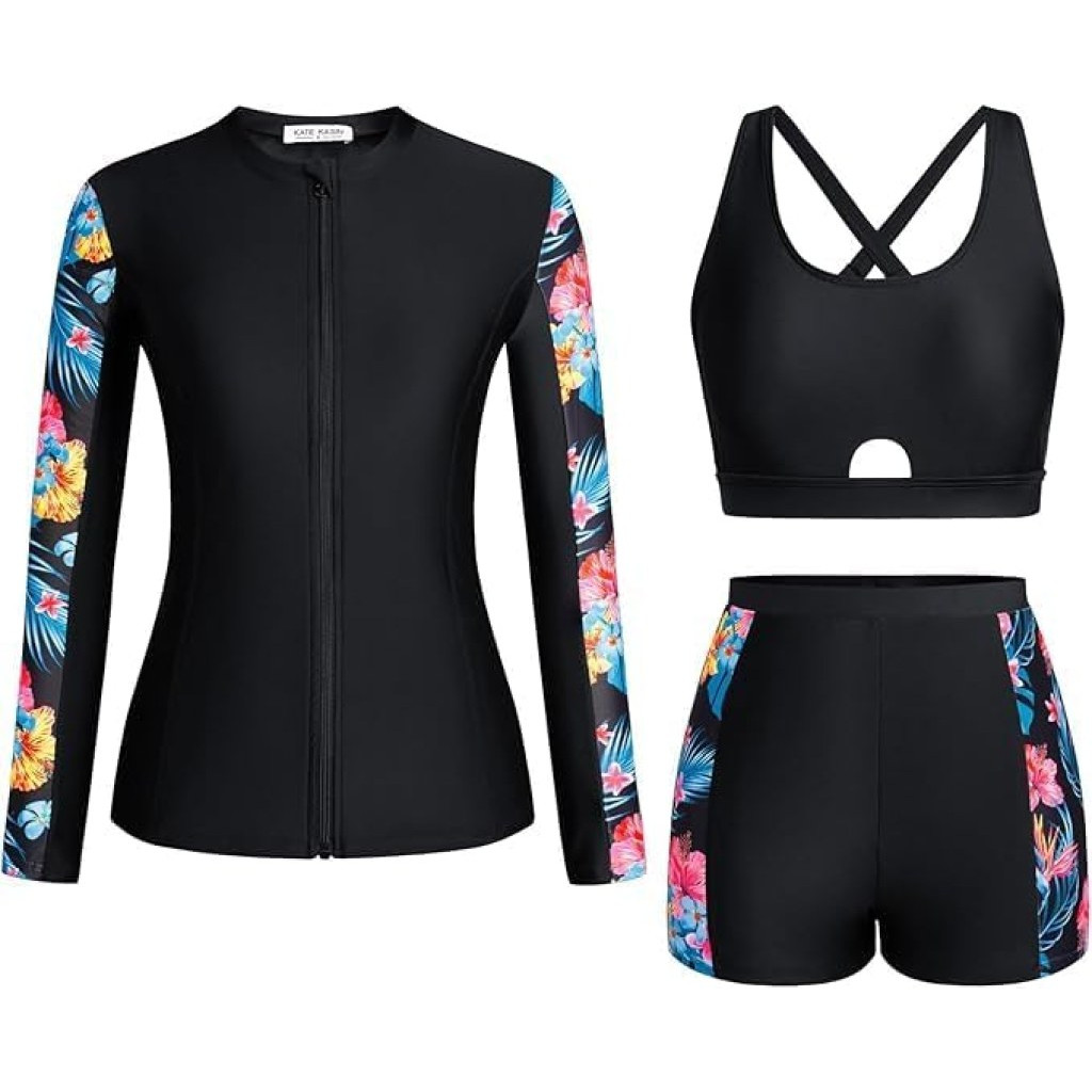 FeatureThree piece set swimsuit, including a swim coat, a swim tops and a swim briefs. Long sleeve crew neck zip-up swim coat with flat-lock stitching.