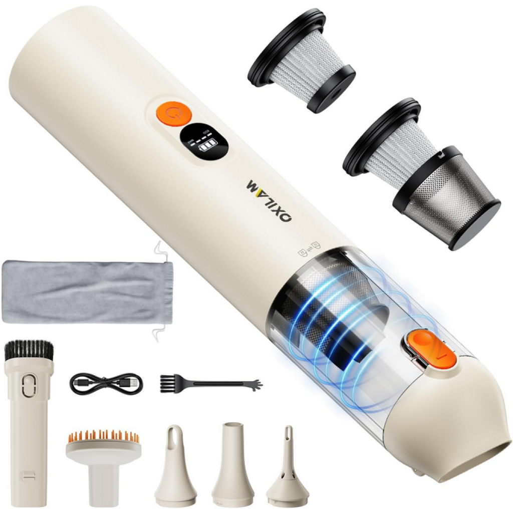 【4 IN 1 MULTI-FUNCTIONAL HANDHELD VACUUM CORDLESS】OXILAM Cordless Vacuum Cleaner combines the different needs of vacuuming, blowing, inflating and pumping. It not only quickly clean the car, the Shutters, closet, and sliding glass door Bottom railings and any hard-to-reach places, but also helps to inflate yoga balls, swimming rings and all inflatable items, and vacuums all kinds of vacuum storage bags to save space
